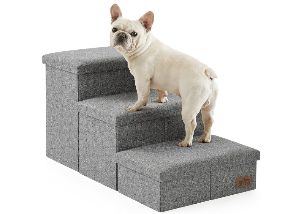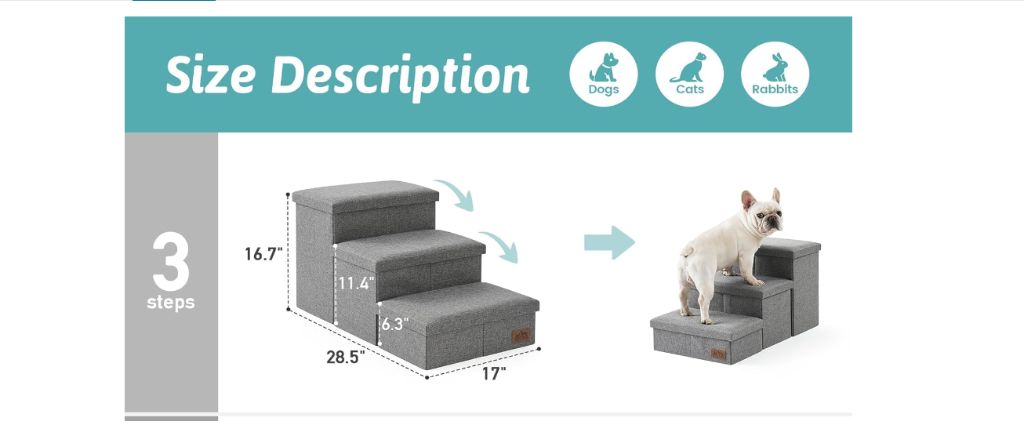 Dog Stairs with Storage, 3-Step Wider Sturdy Dog Steps for Small/Medium/Large Dogs and Older Cats, Folding Doggie Ramp for Bed/Couch/Car Hold Up to 180 Lbs (16.7″ H, Grey)