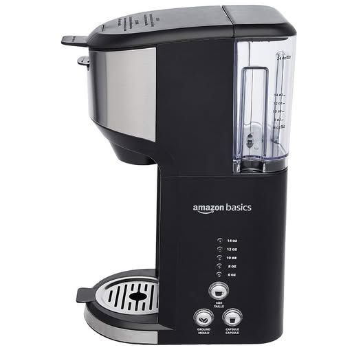 Amazon Basics Drip Coffee Maker with Dual Brewing Mode, Auto Shut-off, Easy-to-Clean Removable Drip Tray, 14 Oz, Black and Stainless Steel, 1200W, 5.98″D x 9.44″W x 14.17″H.