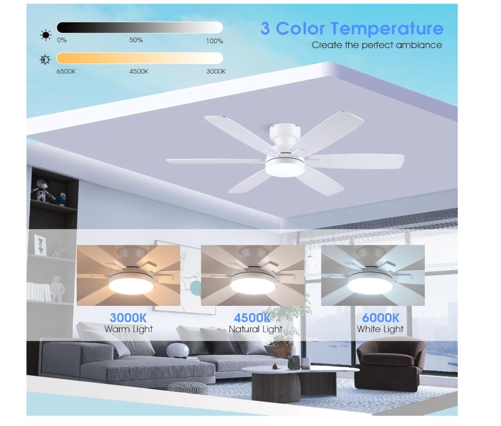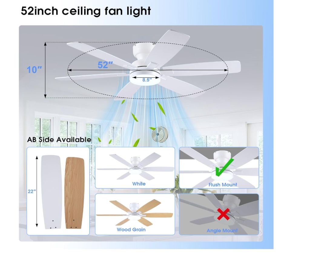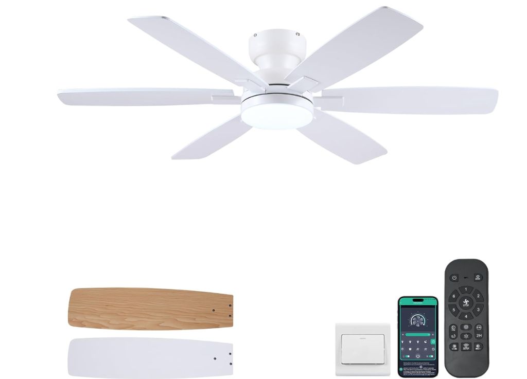 Kviflon 52″ Ceiling Fans with Lights, Low Profile Ceiling Fan with Light and Remote/APP Control, Flush Mount Ceiling Fan with 6 Reversible Fan Blades,…No remote but works with the app by pairing it 5 seconds pug in and out – you can buy a univesal remote