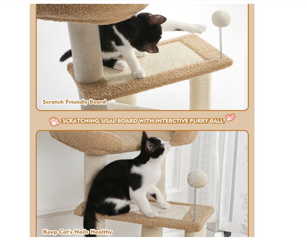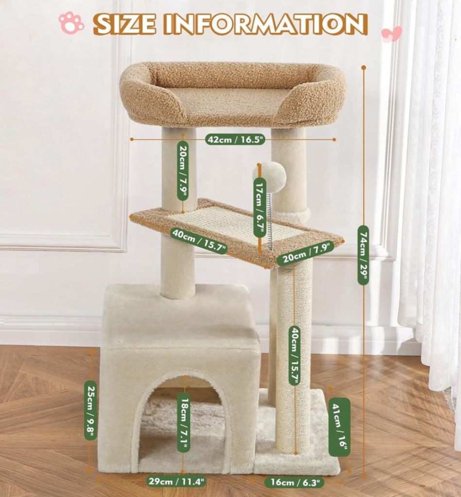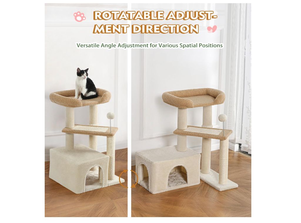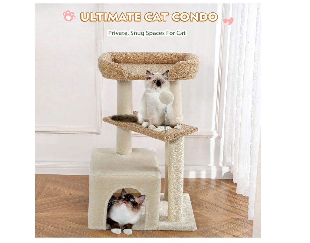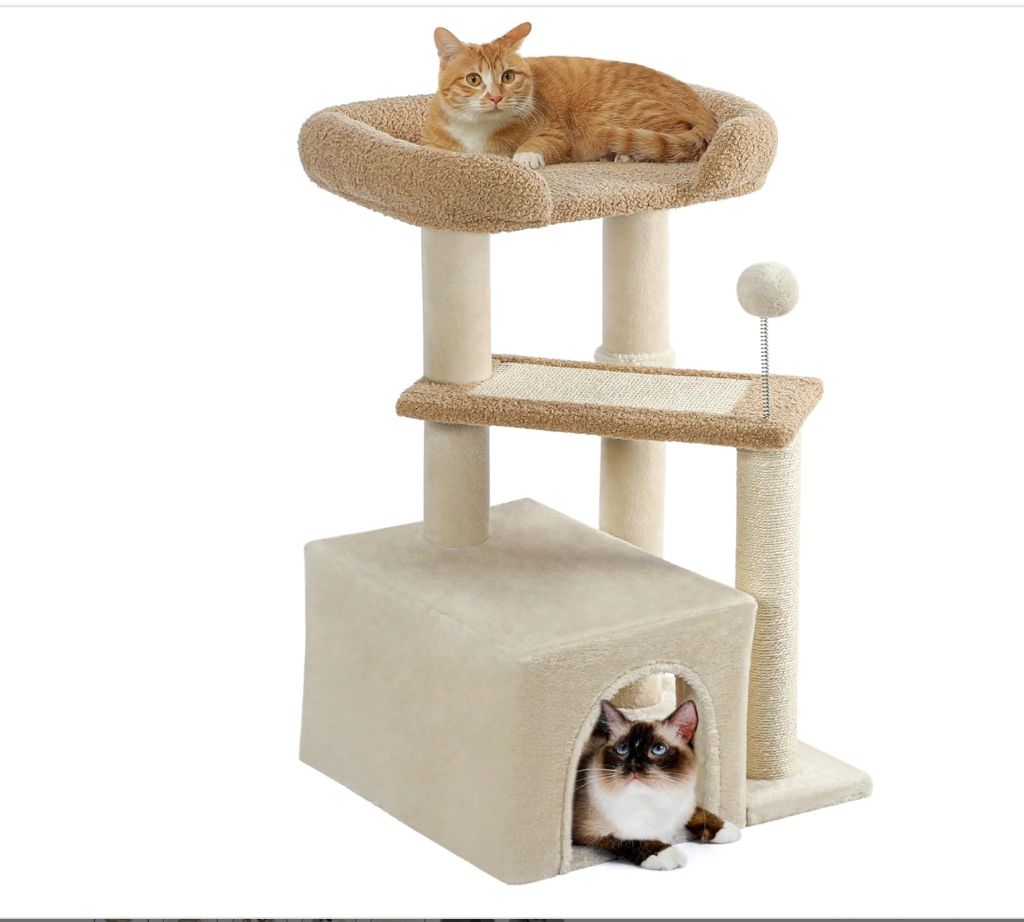 New in boxMade4Pets Cat Tower with Cat Scratching Post Sisal-Covered/Sisal Scratching Board/Large Cat Perch, Cat Tree with 2-Door Condo, Pet House Multi-Level for Indoor Kitten&Medium Cats Ball-Beige/brown