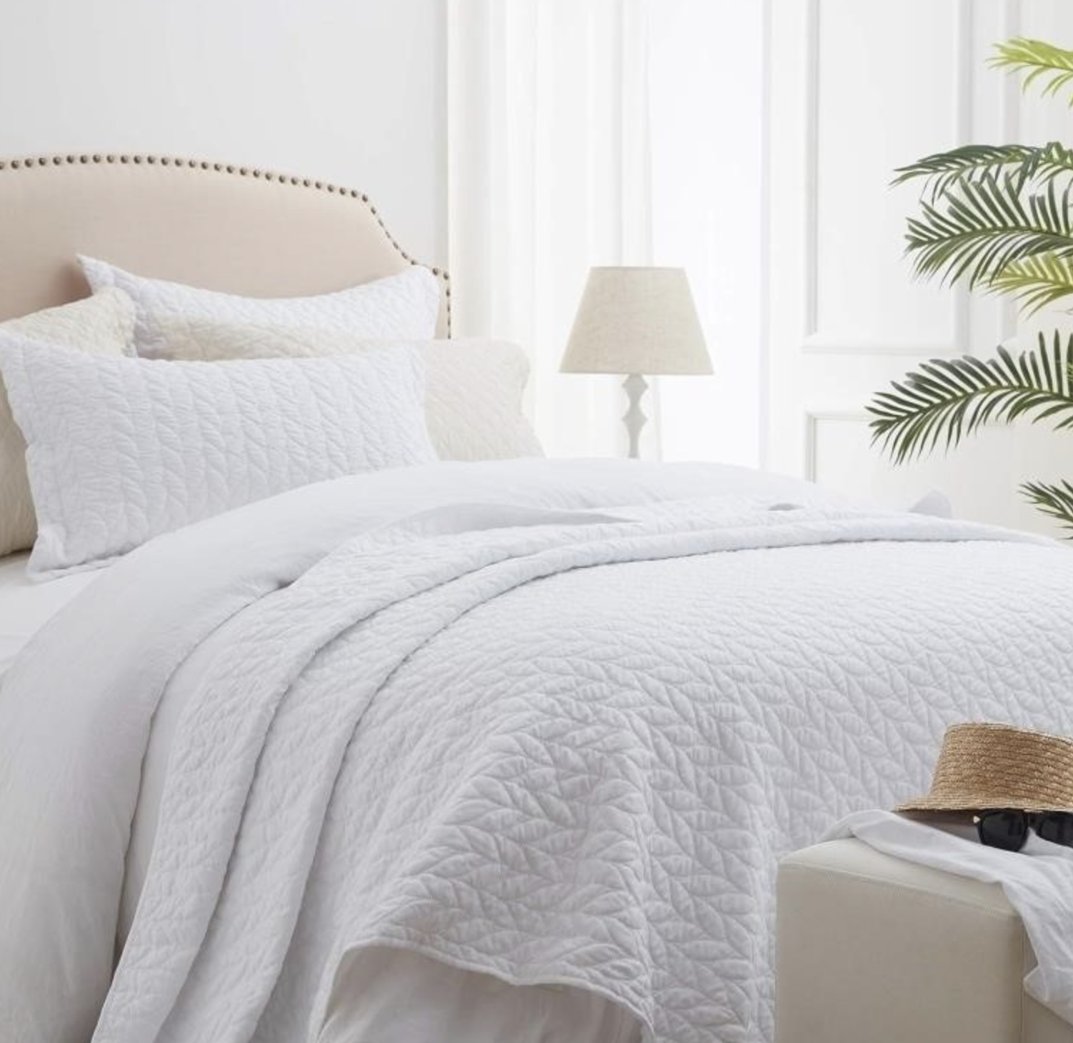 NEWin bagSunStyle Home Quilt Set White Twin Lightweight Bedspread Soft Reversible Coverlet for All Season 2pcs Leaf Embroidered Quilted Bedding Sets (1 Quilt 1 Pillow Sham)(68″x86″)