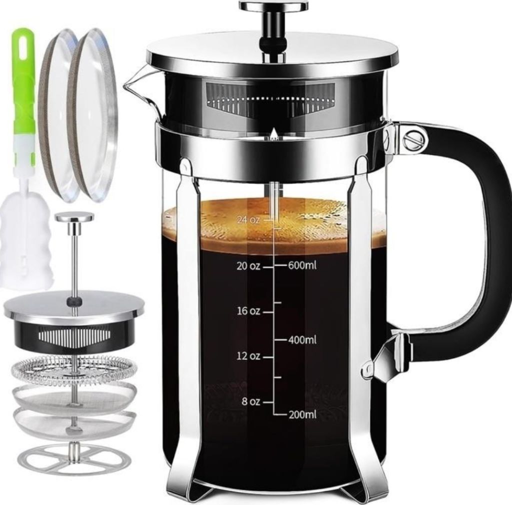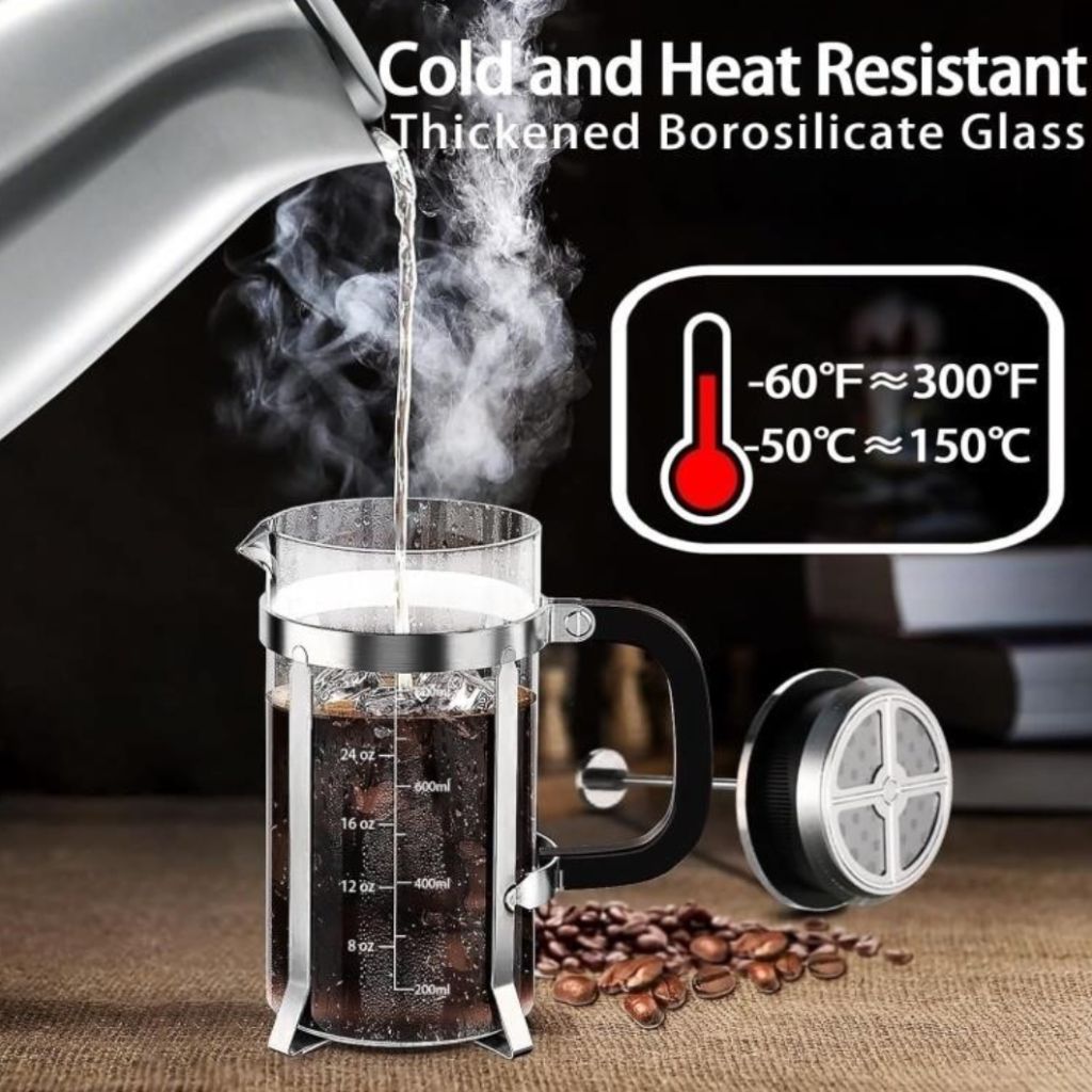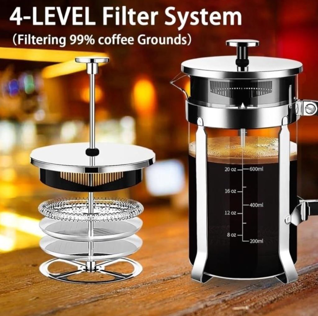 French Press Coffee Maker 304 Stainless Steel Coffee Press,with 4 Filters System, Heat Resistant Thickness Borosilicate French Press Glass, BPA-Free Brewed Tea Pot Coffee PlungerThis 21oz french presses can be used as a coffee press, tea maker or milk frother. 3 to 4 cup coffee maker Suitable for home office and outdoor activities, such as camping, family gatherings.