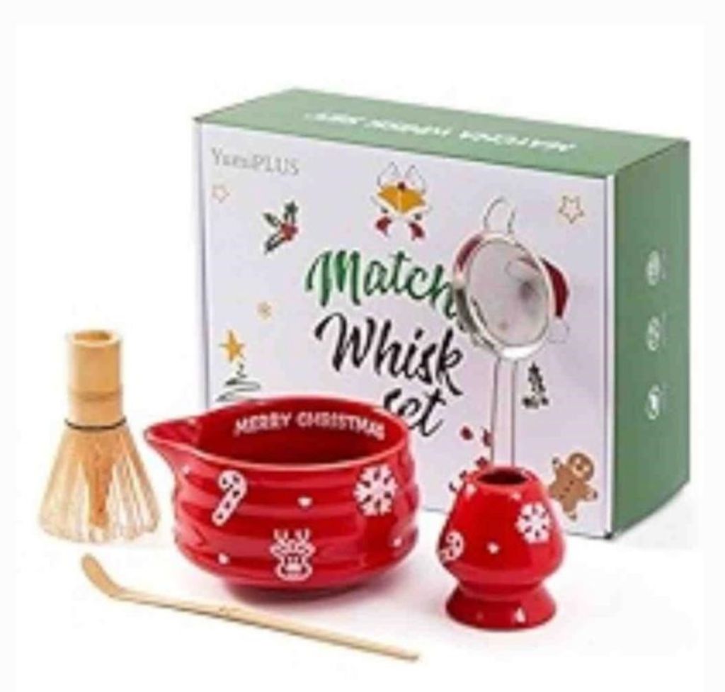 YumiPLUS 5pcs Premium Matcha Set,Ceramic Bowl with Spout and Bamboo Whisk set, Ceremonial Matcha Kit for holiday,Tea Starter Making Kit,Christmas Matcha Gift set (Reindeer Red)